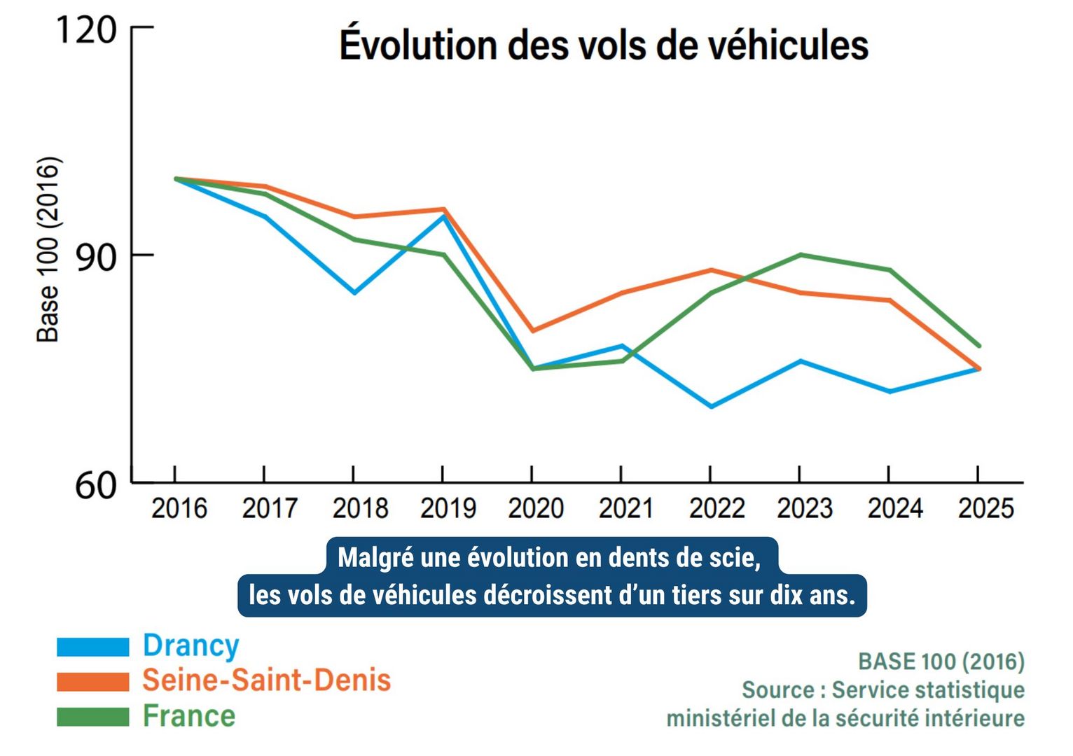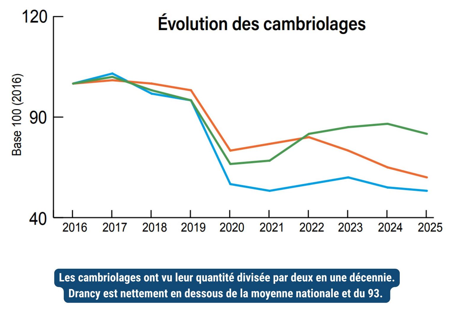 À l’heure où le nouveau maire de Saint-Denis souhaite désarmer la police municipale, Drancy a fait le choix d’une présence policière visible, rapide et efficace, avec près de 8 000 interventions annuelles. Sans oublier un effectif important de 39 policiers municipaux, avec le recrutement de 20 agents en 2023. Et cela se traduit dans les chiffres, meilleurs sur les six dernières années que ceux de l’ensemble de la Seine-Saint-Denis. L’analyse des données de la délinquance sur la période 2020-2025 met en évidence des évolutions toutefois différenciées selon les types de faits.