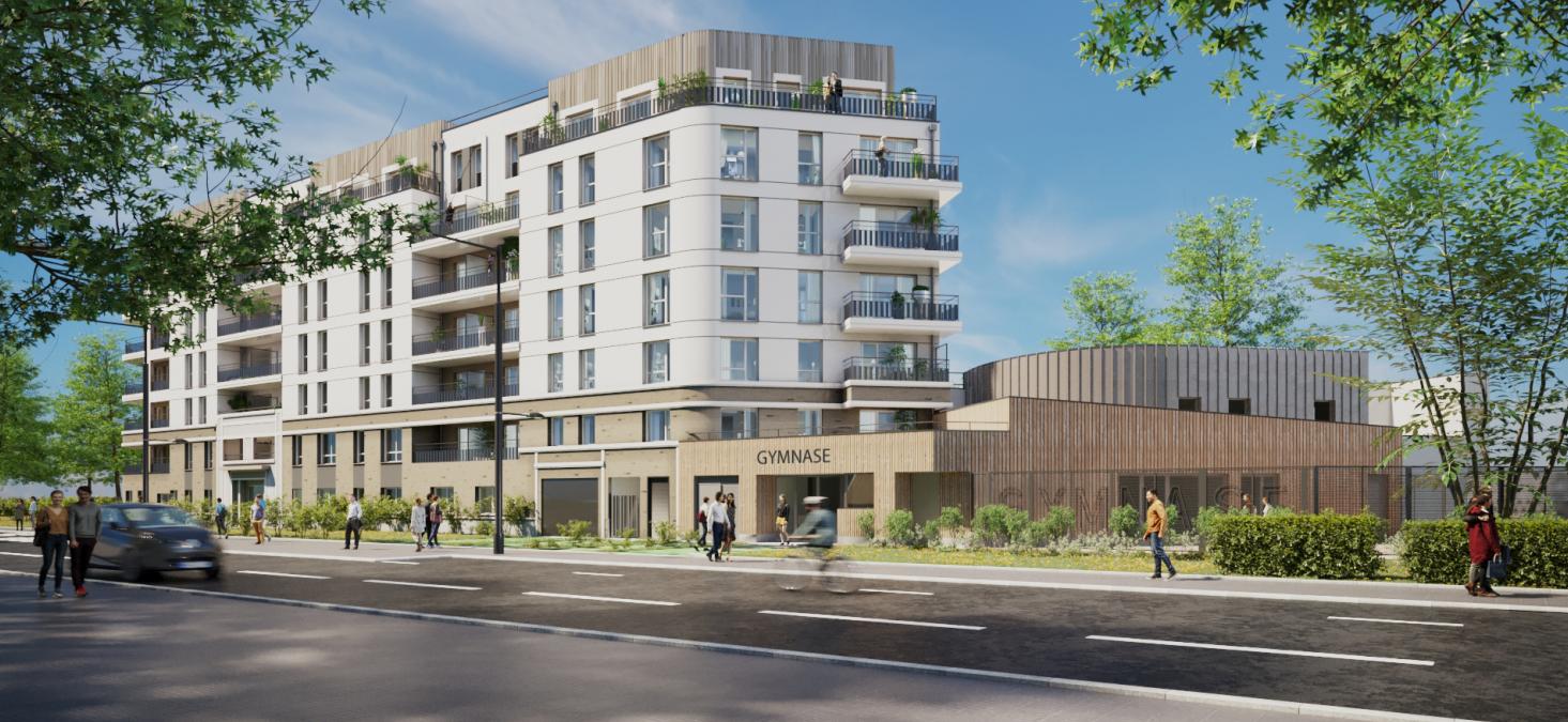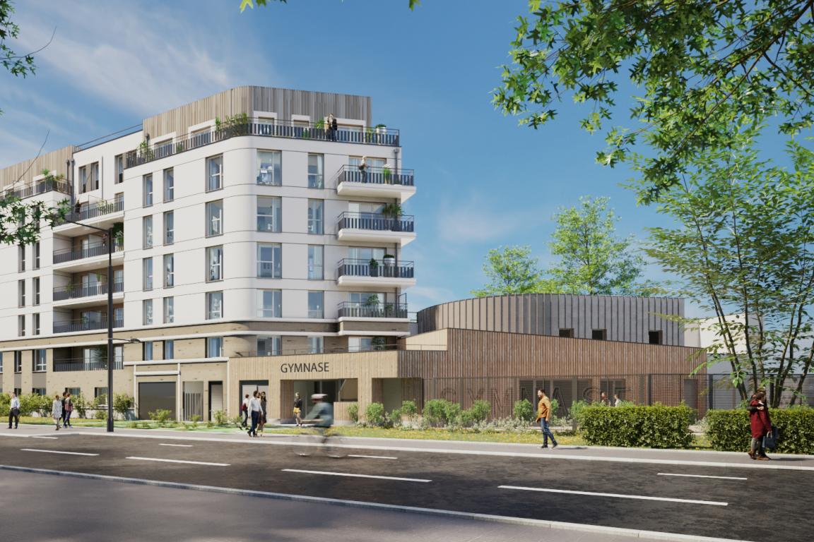 La construction de ce gymnase répond parfaitement aux besoins d’un équipement sportif, mais s’inscrit aussi dans un style architectural proche des nouveaux logements voisins. La façade du bâtiment sera sublimée par un revêtement en bois vertical, facilement identifiable depuis la rue. L’équipement sera surplombé par un volume arrondi en zinc, apportant une touche dynamique et fluide à l’ensemble. Le gymnase sera couvert d’une toiture végétalisée, contribuant à son intégration harmonieuse dans l’environnement et optimisant sa performance thermique. Une attention particulière a été portée à l’apport en lumière naturelle grâce à des ouvertures située sur la toiture et judicieusement dimensionnées. Celles-ci permettent un éclairage optimal de l’espace tout en assurant un bon équilibre entre luminosité et confort visuel.