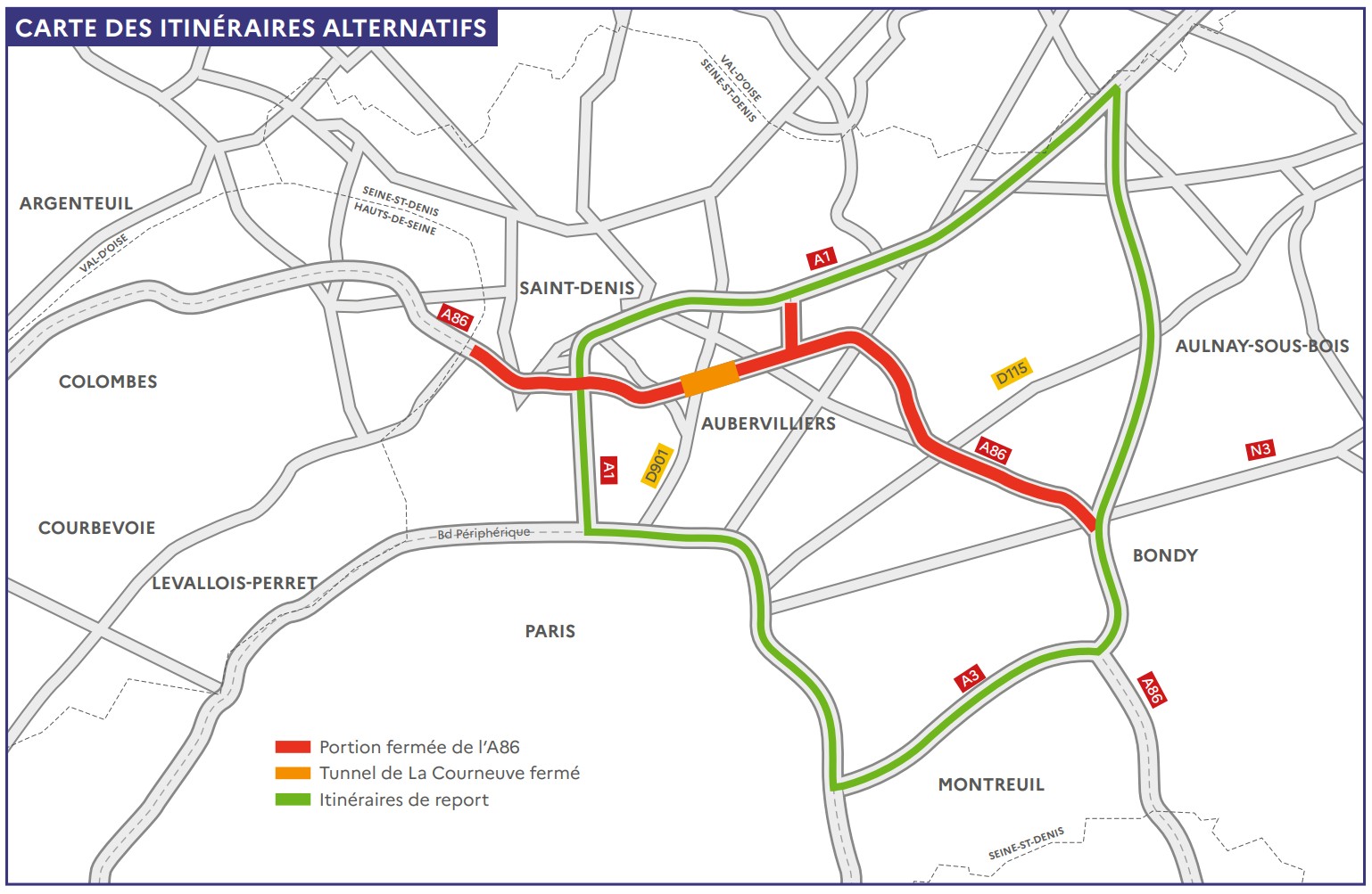 Pendant ces périodes, des itinéraires de déviation seront mis en place via les grands axes du réseau francilien, notamment les autoroutes A1 et A3 ainsi que le boulevard périphérique.