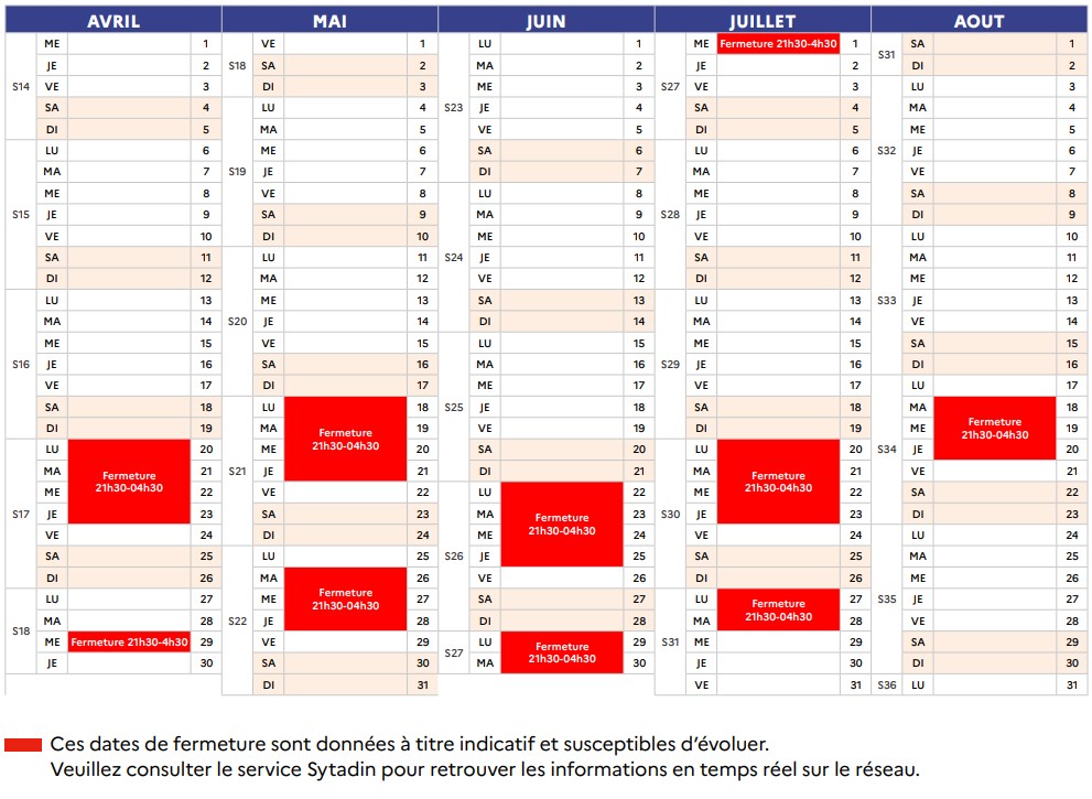 Les dates de fermeture étant susceptibles d’évoluer, il est recommandé de consulter les informations trafic en temps réel, notamment via le service Sytadin.