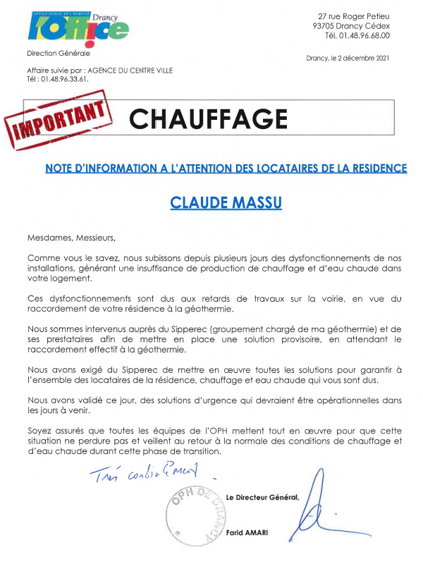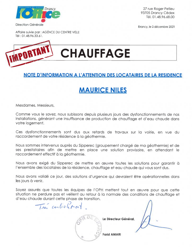 Le Maire de Drancy, Aude LAGARDE, a instamment demandé à l'Office de tout mettre en œuvre pour assurer aux locataires, chauffage et eau chaude qu'ils sont en droit d'attendre au plus fort de l'hiver.
